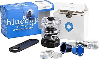 BLUECUP Capsules Rechargeables Nespresso, Dosettes Réutilisables Compatibles avec les Machines Nespresso (gamme Original), [2 capsules + 100 couvercles + 1 scelleur de capsules + 1 cuillère]